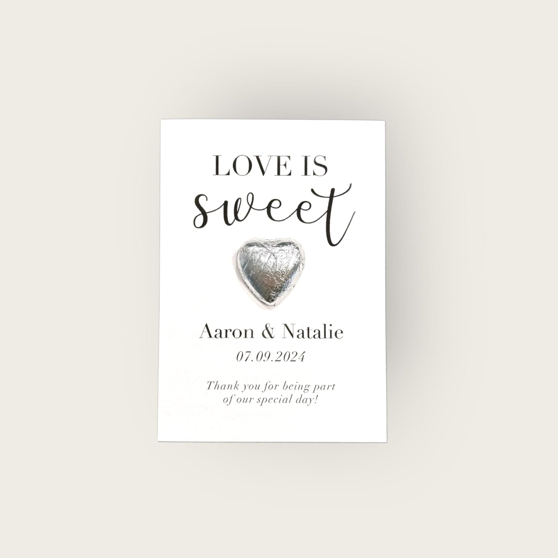 Celebrate your love story with a gift that's as unique and beautiful as your special day. Our elegant custom cards are designed to perfectly complement your event, featuring the heartfelt message "Love is Sweet." Each card is meticulously personalized with your names and wedding date, and is adorned with a foil-wrapped heart chocolate. It's a small but powerful gesture to thank your guests and leave them with a sweet memory of your celebration.