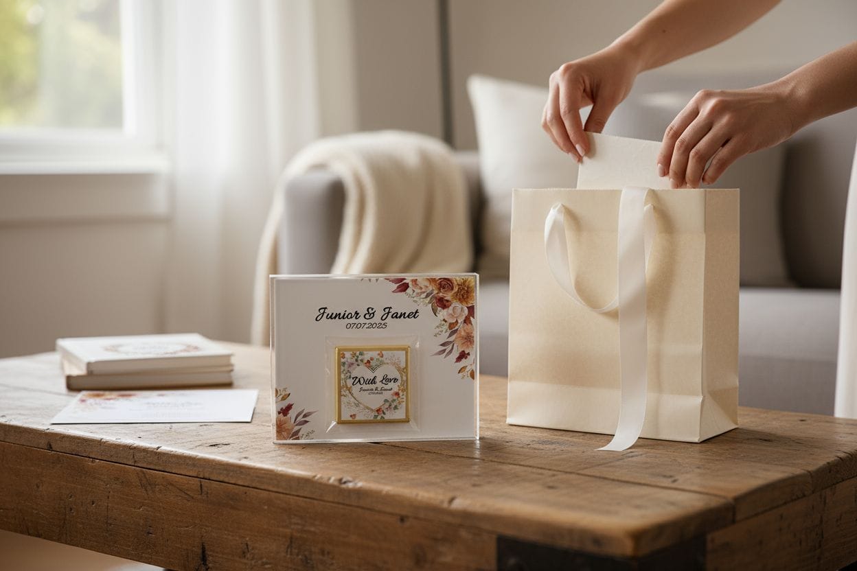 Offer your guests a beautifully warm token of your special day! This elegant gift features a personalized 4x4 cm square chocolate secured onto a charming 10x10 cm floral card. Adorned with rich autumnal floral motifs (terracotta, burnt orange, and deep greens), this "Autumn Love" themed favor is the sweetest way to express your gratitude. Displaying your names and special date, it's the perfect table favor for rustic weddings, autumnal celebrations, engagements, or any meaningful event.