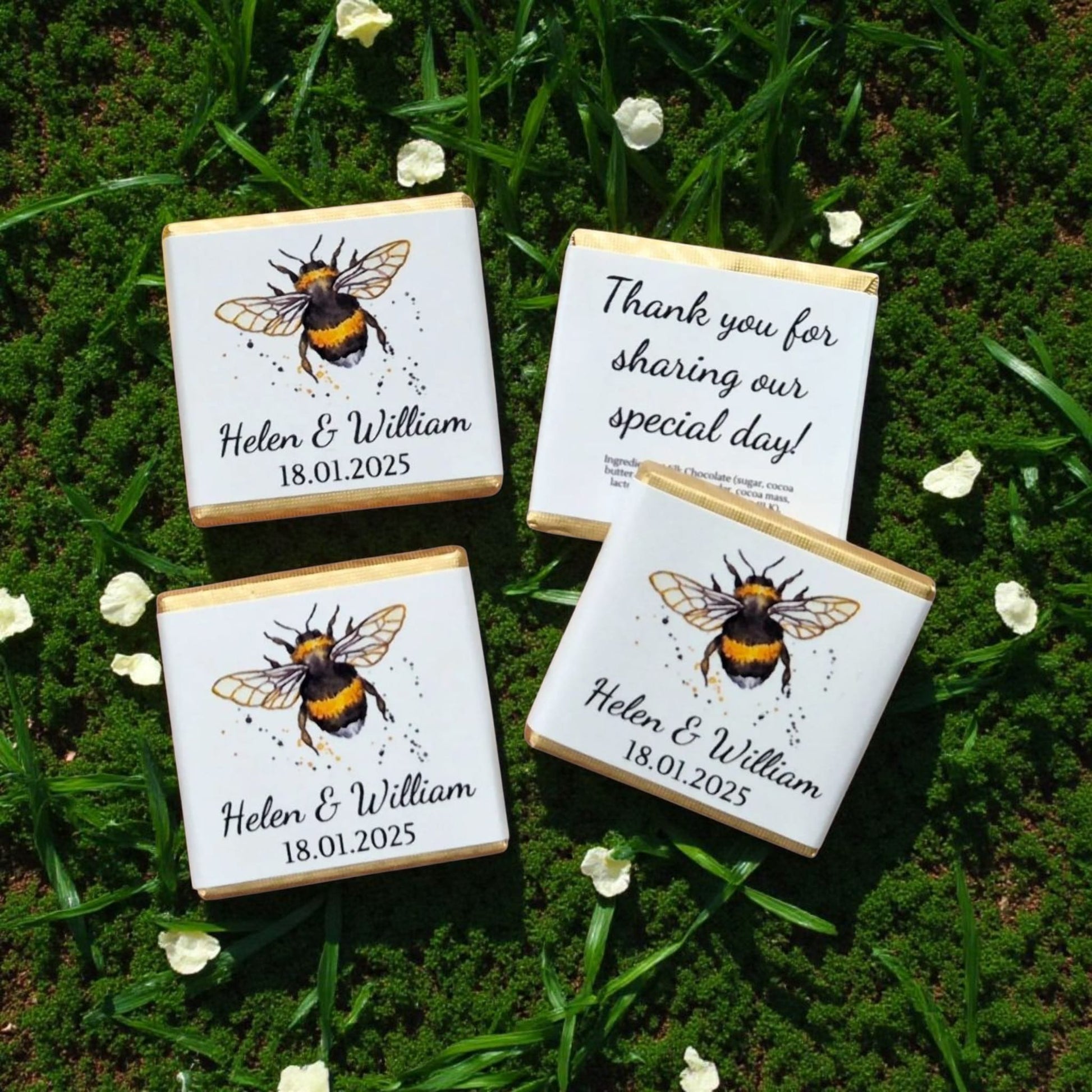 Add a buzz of sweetness to your special day with these charming bee-themed chocolates. Perfect for weddings, anniversaries, or any celebration, this unique favor is a delightful way to thank your guests. Each elegant chocolate square is customized with a beautiful bumblebee design, your names, and the date, creating a memorable keepsake that’s as sweet as your memories.