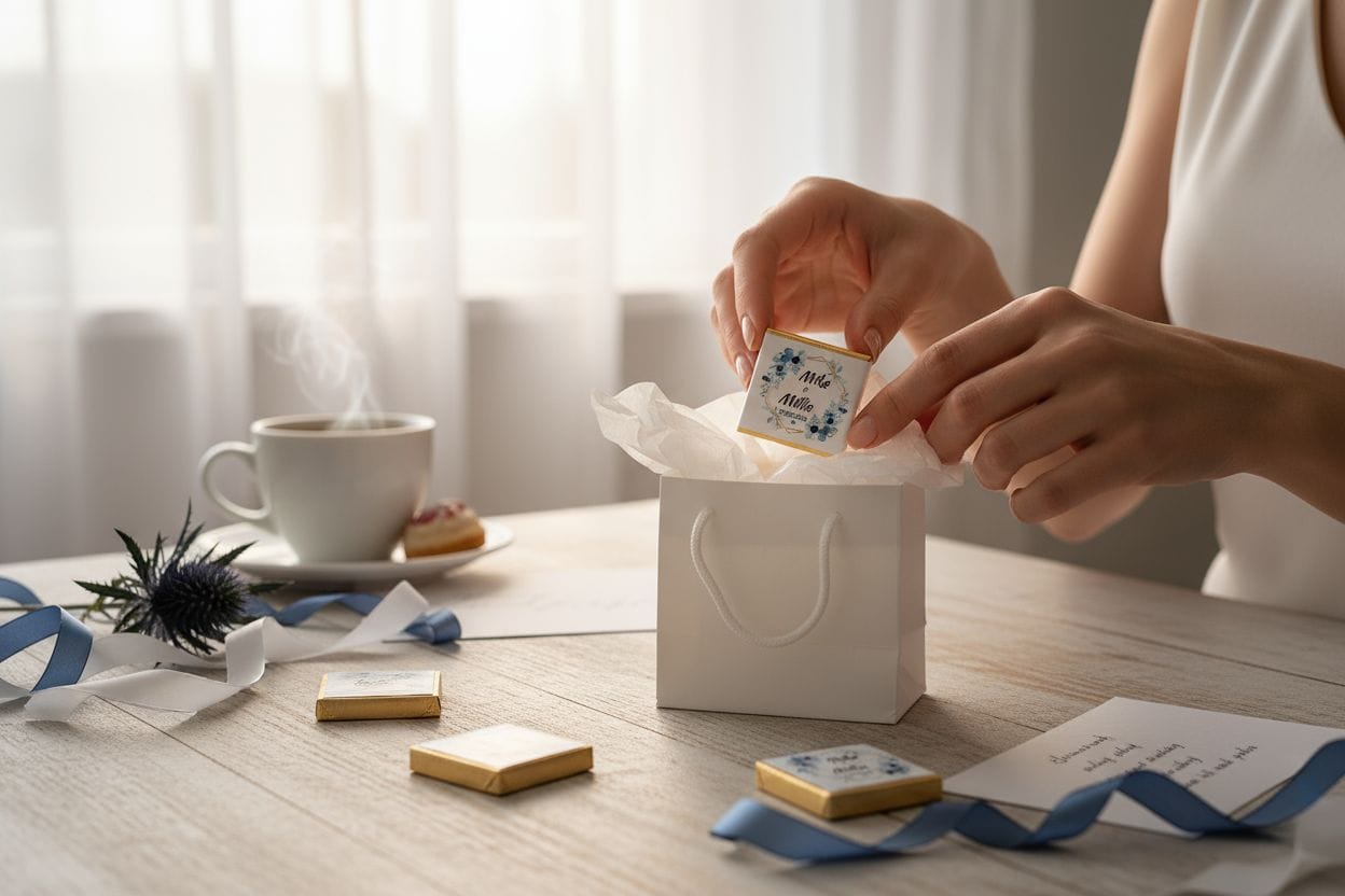 This modern and elegant design, featuring a motif of blue florals and a geometric frame, adds a sophisticated touch to your wedding, engagement, or anniversary celebration. Each milk chocolate creates an unforgettable and stylish favor for your guests and can be completely personalized just for you.