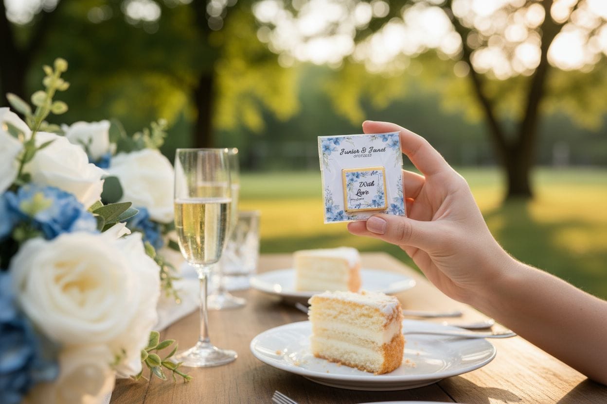 Offer your guests a beautifully refreshing and sweet memento of your celebration! This charming favor features a personalized 4x4 cm square chocolate secured onto an elegant 10x10 cm card. The design is beautifully adorned with vibrant blue and white floral clusters, creating a serene and memorable look. This "Forget-Me-Not" favor is the perfect table setting accent for spring, summer, or destination weddings, or any event with a classic blue and white theme.