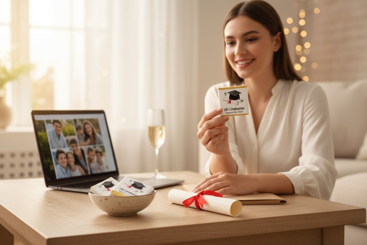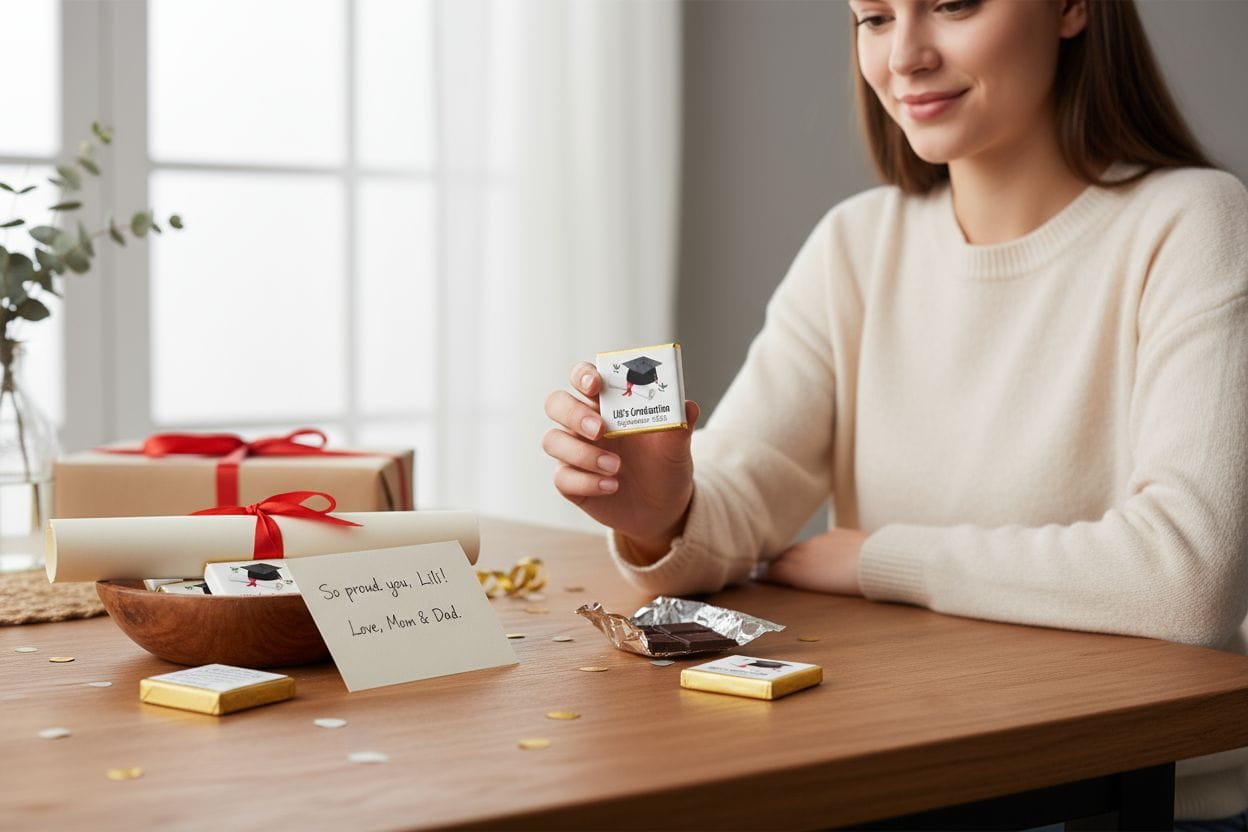 Celebrate this major milestone with a gift as sweet as their success! Our personalized graduation chocolates are a perfect way to honor the graduate's hard work and dedication. Each chocolate square features a custom label with a graduation cap design, the graduate's name, and the date, making it an elegant and heartfelt party favor for family and friends. It's the perfect way to share the joy of their achievement!
