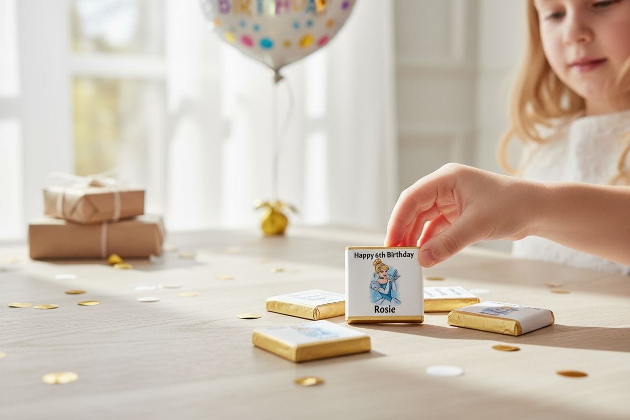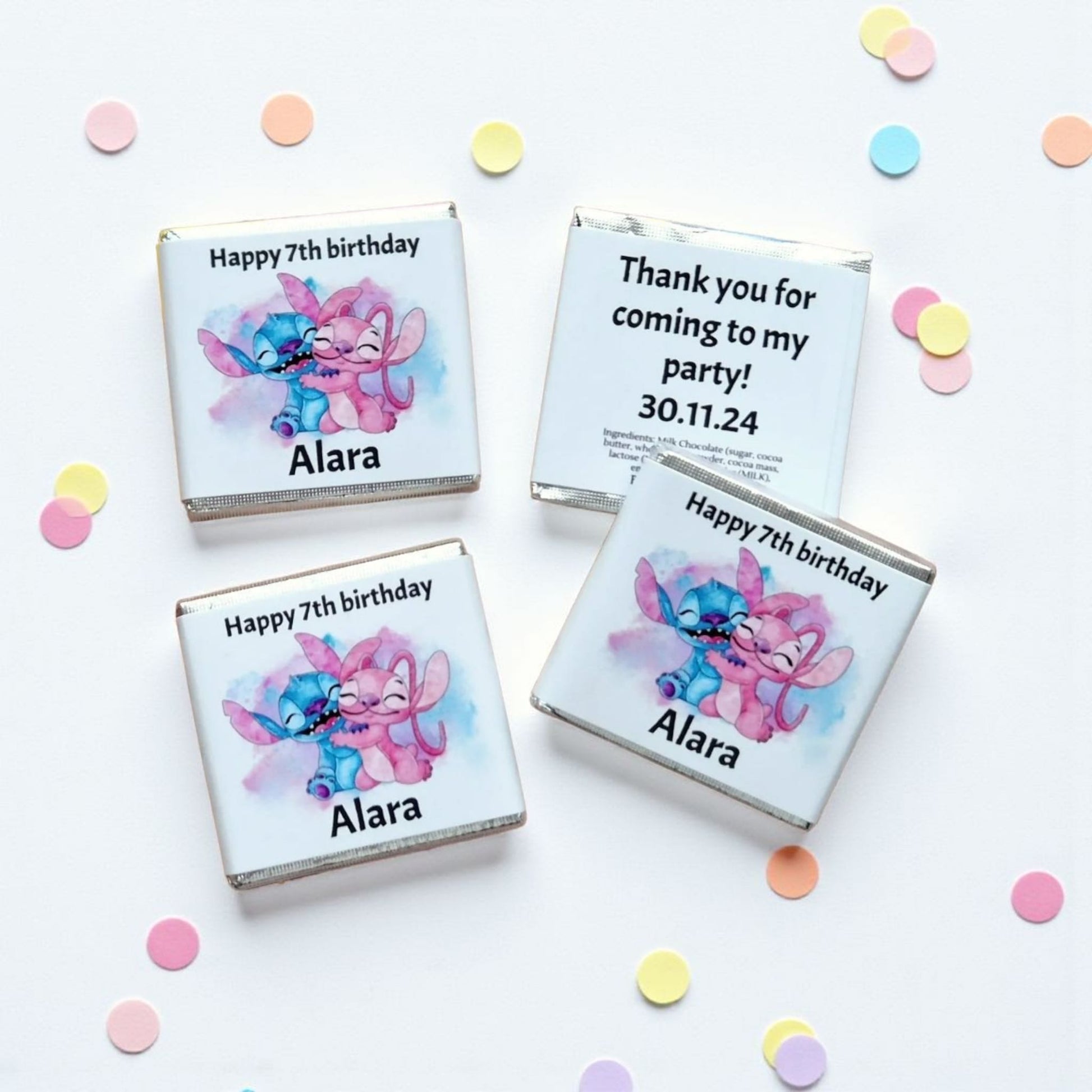 Description: Celebrate with your "ohana" and these adorable Stitch themed chocolates. Featuring the mischievous yet lovable duo, these favors are a sweet way to thank your guests for sharing your child's special day. Each milk chocolate square is customized with your child's name and age, creating an unforgettable party treat that reminds everyone that "family means nobody gets left behind."