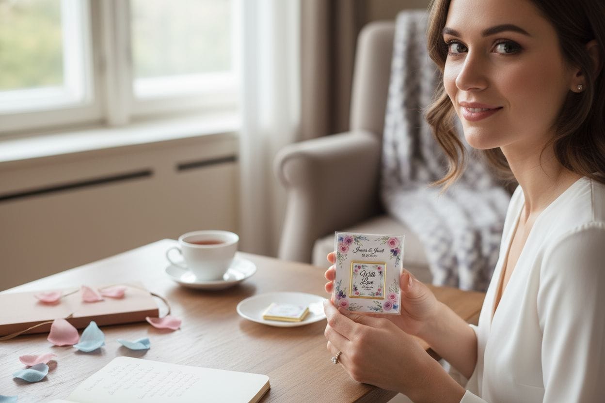 Present your guests with a token of your most special day! This elegant gift features a personalized 4x4 cm square chocolate secured onto a beautiful 10x10 cm floral card. Adorned with vibrant pink and purple floral motifs, this "Magic of Love" themed favor is the sweetest way to express your gratitude. Displaying your names and special date, it's the perfect table favor for weddings, engagements, baby showers, or any meaningful celebration.