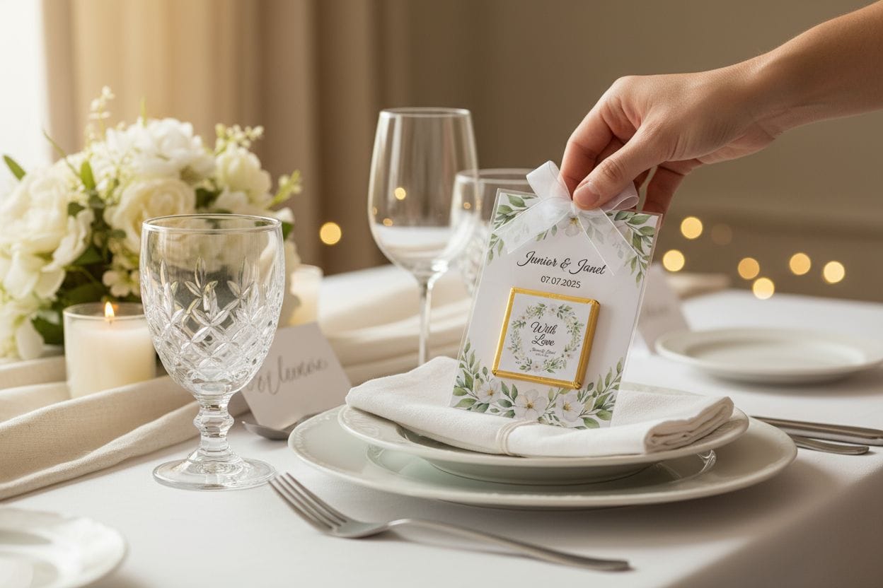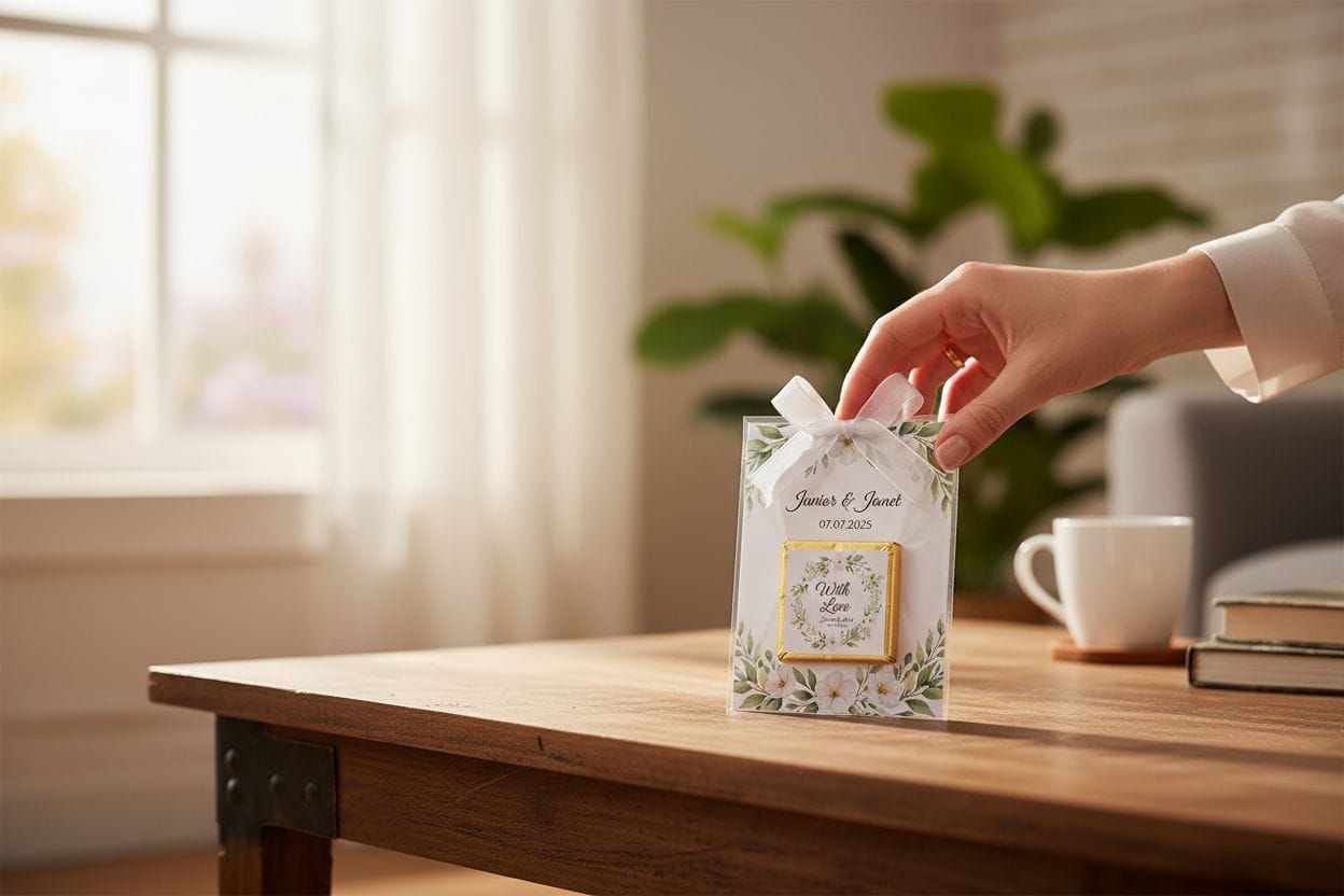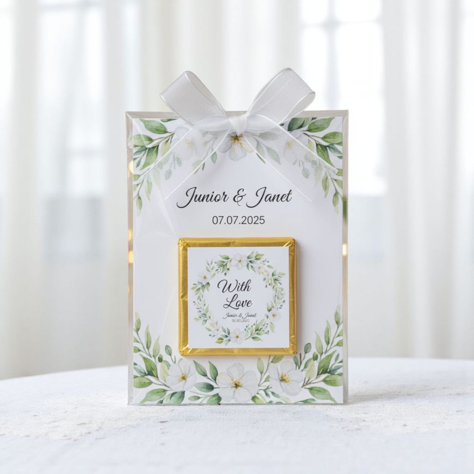 Present your guests with a fresh and charming keepsake from your special day! This delightful favor features a personalized 4x4 cm square chocolate secured onto an elegant 10x10 cm card. Adorned with simple, vibrant green leaf and botanical motifs, this "Natural Love" themed gift is a sweet and modern way to express your gratitude. Displaying your names and special date, it's the perfect table favor for rustic weddings, garden parties, or any celebration with a natural touch.