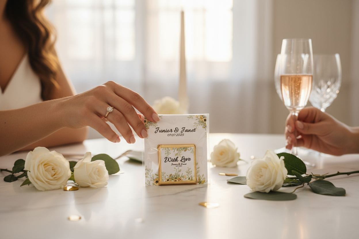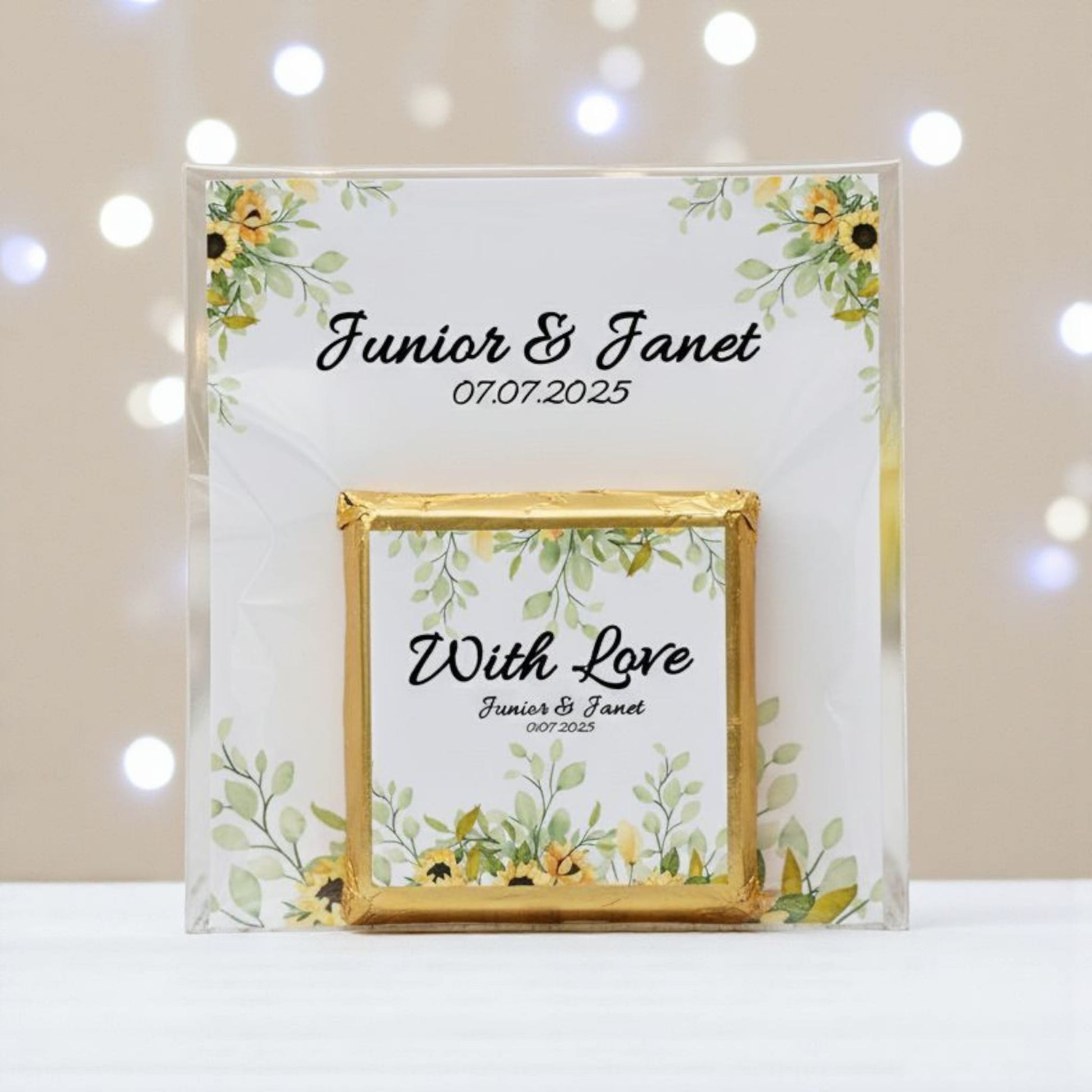 Brighten your celebration with a sweet and cheerful memento! This charming favor features a personalized 4x4 cm square chocolate secured onto an elegant 10x10 cm card. The design is beautifully adorned with vibrant yellow sunflower motifs and delicate greenery, creating a warm, joyful, and rustic-chic aesthetic. This "Sunny Day" favor is the perfect table setting accent for summer, rustic, or barn weddings, or any event where warmth and happiness are celebrated.